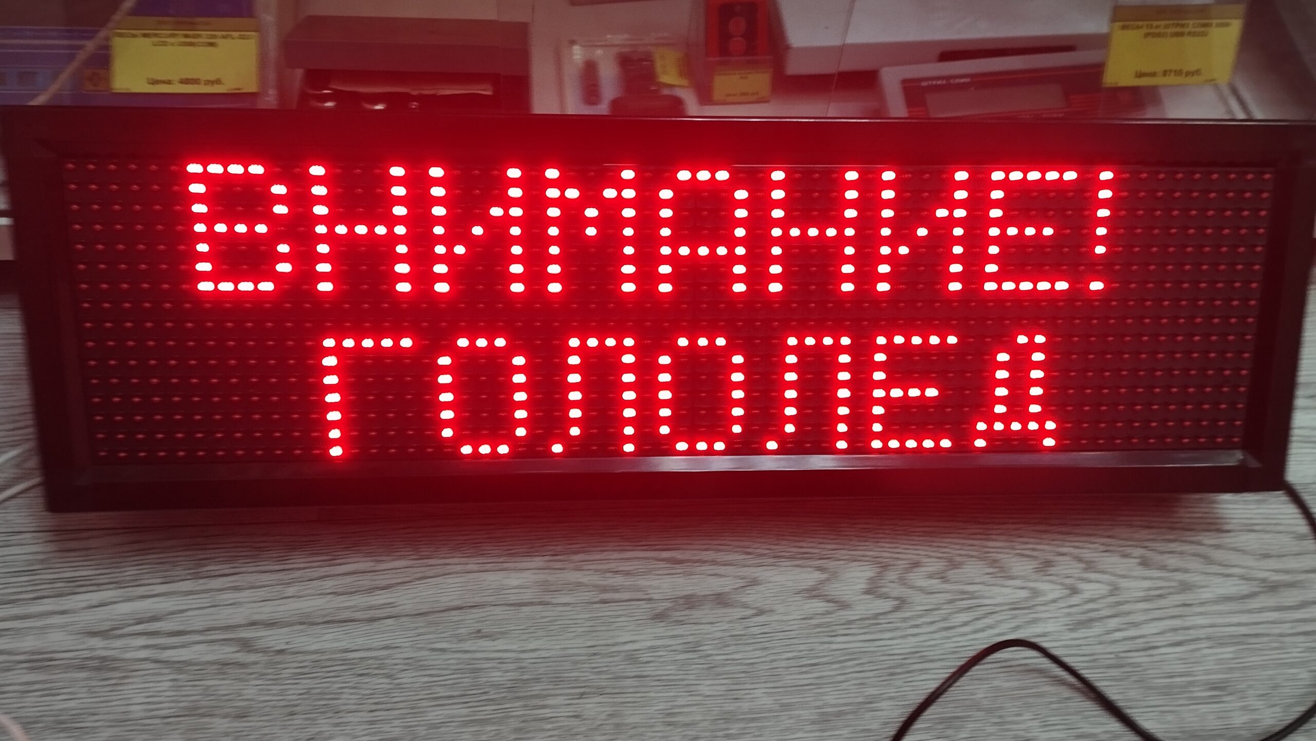 Отображение информации (очередность, объем, статическое, динамическое и т.п.) зависит от размеров выбранного Вами табло. Данное табло имеет размеры светового поля 64х16 пикселей матрицы P10 (один светодиод на 1 см²). Уникальность нашего предложения заключается в масштабируемости размера табло в зависимости от Ваших потребностей в дальности для нормального прочтения информации,  содержания информации, выбора цвета свечения светодиодов.